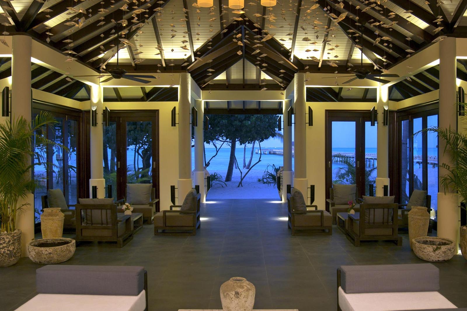 A relaxed beachside restaurant with a sandy floor, high ceilings, and huge glass windows offering breath-taking views of the calm, crystal clear turquoise lagoon and the horizon beyond.