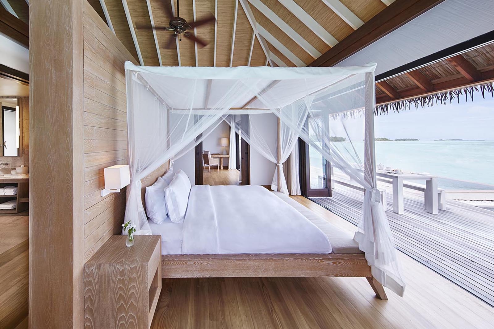 These overwater suites are located above the water and occupy their own jetty with spectacular views of the Maldivian sunrise. They feature a large bedroom with a living area and wide doors that open to a terrace with a plunge pool and direct access to the turquoise lagoon. The bathroom features a sunken bath and outdoor shower.
