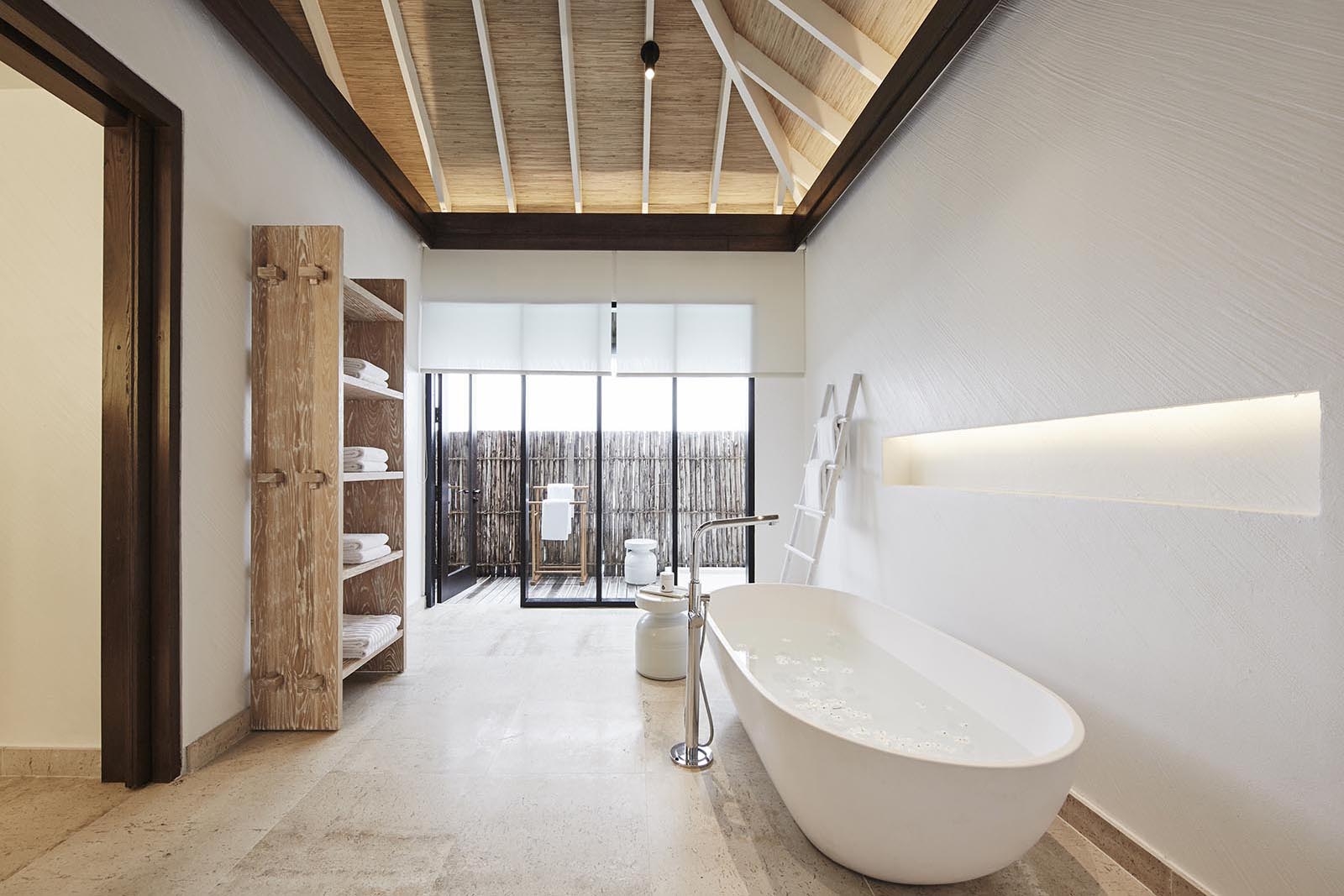 These two-bedroom villas (one king and one smaller twin room) have their own access to the beach, as well as their own private pool. Elegant, simple interiors are lit up with large windows to make the most of the island setting, with French doors giving guests access from the bedroom to the terrace where they can relax within their own private plunge pool.