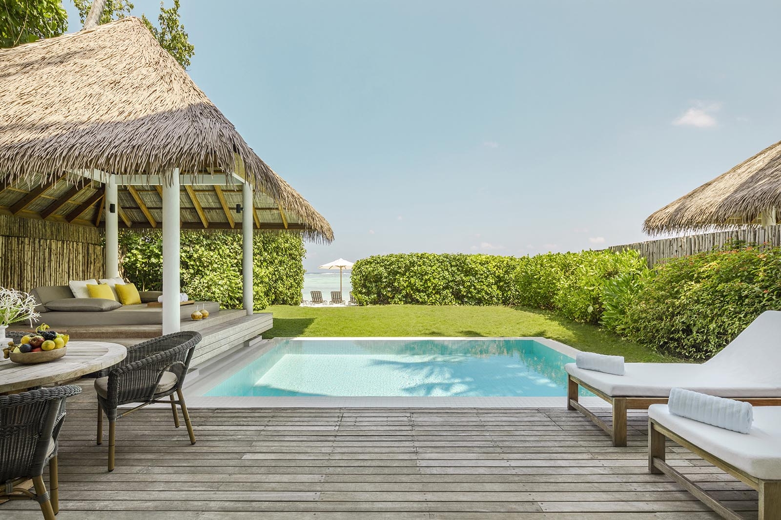 Beach Villas sit to the west of the island, with direct beach access and sundecks to lounge on in the glow of each Maldivian sunset. These villas are our largest one-bedroom accommodation with ample dining and living areas, for families that enjoy enhanced privacy and the luxury of extra space. Beach Villa living is a unique mix of privacy and openness: French doors connect the bedroom to the poolside and the bathroom blends into the outdoors.