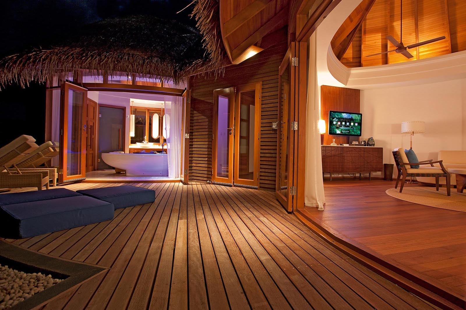 Hovering over the turquoise lagoon, these 100sq m open-plan villas have a nautical colour palette and a roof shaped like an upturned boat. Each has a king-size bed and a spacious bathroom with his and hers wardrobes, indoor and outdoor showers, a separate toilet and a freestanding bath tub. There’s also a double sofabed that’s perfect for a child (or two if they’re small). Blissful sunbathing can be had on the expansive private deck, which is furnished with sun loungers and comes complete with a come-hither plunge pool; those fancying a spot of sea-paddling can dive off from the adjoining lower deck. There’s also a double sofabed that’s perfect for kids. This room has free WiFi, a telephone, an iPod connection, individually controlled air-conditioning, safe, a writing desk and jaw-dropping ocean views.