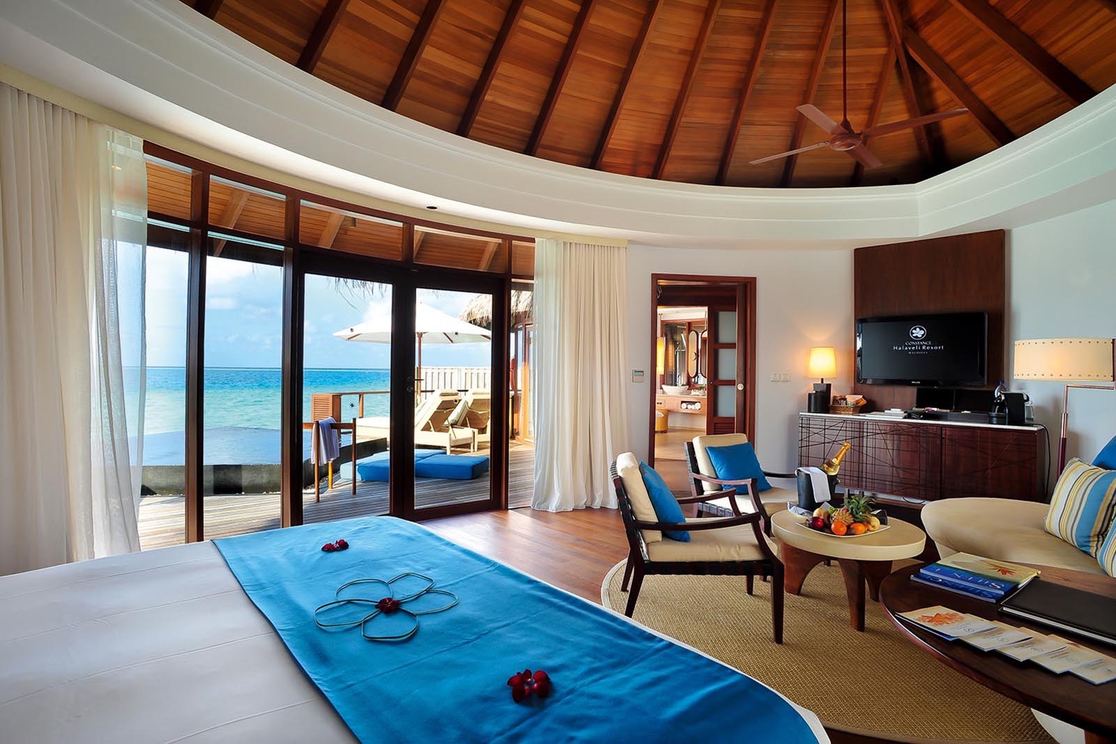 Resort Constance Halaveli is a 35-minute seaplane ride and a 75-minute ride from Male. Airport transfer is provided.
