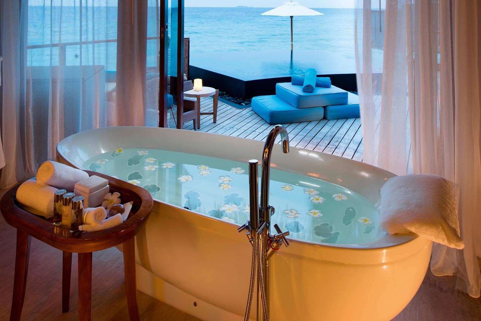 This grande dame of villas is a luxurious 700sq m pad, spread over two sprawling floors. Each of the three bedrooms features a king-size bed, walk-in wardrobes, access to a balcony or terrace, and a private ensuite; bathrooms have two sinks, a free-standing bath tub and an indoor or outdoor shower. On the ground floor, there is a separate living room and dining room, both with soaring ceilings and ocean views. Fitness-aficionados will love the gym; those seeking indulgence can book an in-villa spa treatment in the opulent spa room – just ask the villa’s private butler. A sun-kissed deck is furnished with loungers and umbrellas, and leads to the glistening plunge pool or bubbling Jacuzzi. The room also includes individually controlled air-conditioning, writing desk, safe, telephone and iPod connection. Extra bed charges: Complimentary for children between 0-6. USD 190 for children between 7-12 years old in includes breakfast, USD 240 for Half Board, and $305 for All Inclusive, USD380 for ages 13 and up includes breakfast, USD 480 for Half Board, and $610 for All Inclusive. All extra bed charges are inclusive of tax.
