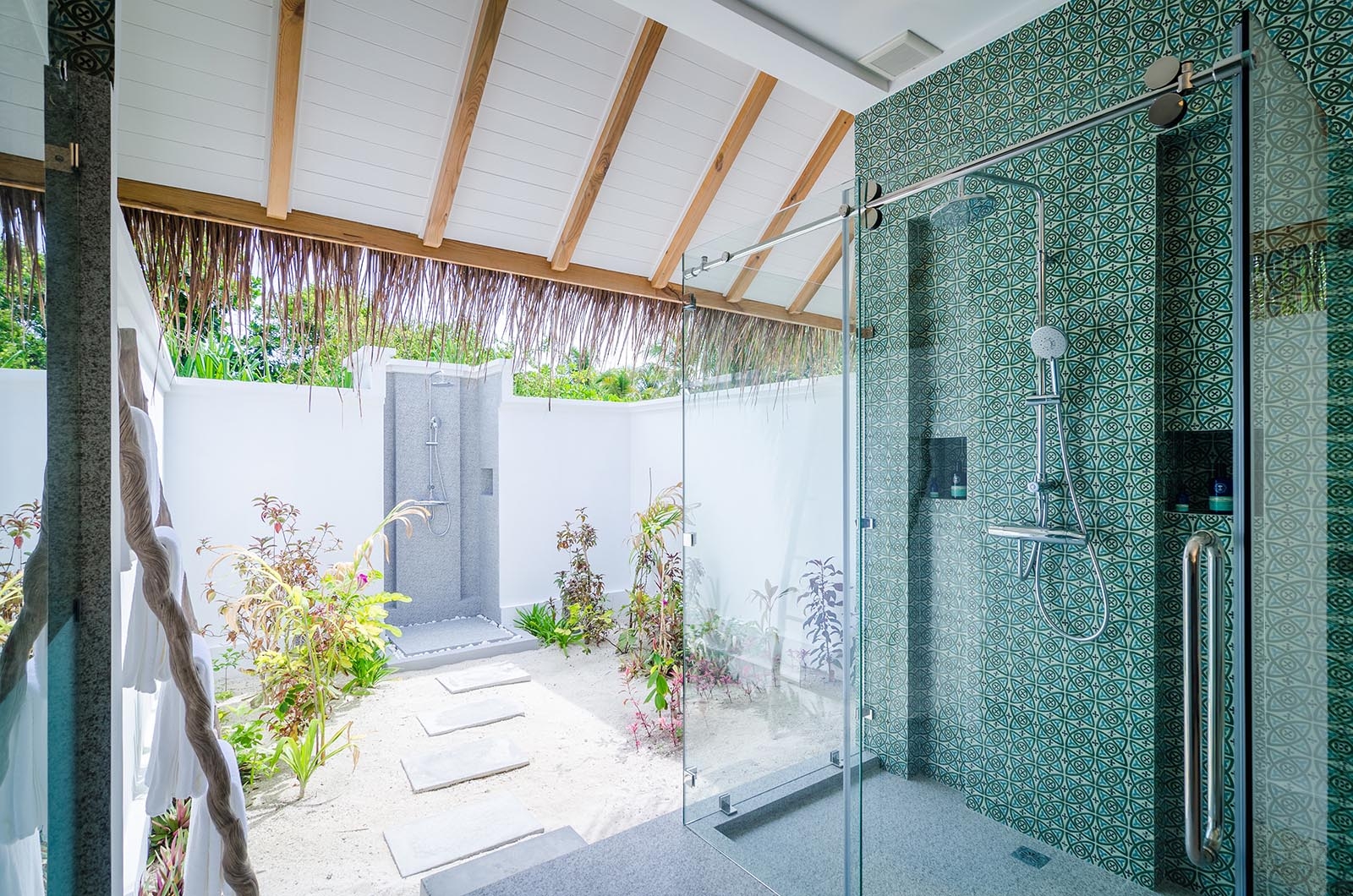 In our Maldives beach villas you’re guaranteed to get that Robinson Crusoe feeling. There’s a view of the green garden directly from your bed. Immediately behind it there’s the beach and the turquoise blue sea. Its light colours give this fine 205 m² / 2206 f² garden residence a lightness and freshness. At the back there’s a spacious bathroom with tub and shower and an open-air area where you can look at the stars while you take a shower.