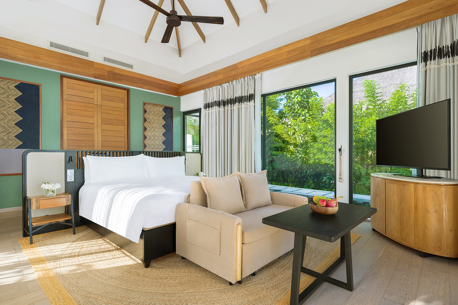 The villa includes a king size bed, complimentary WiFi, coffee / tea facilities, a 55-inch HDTV, laptop safe, air conditioning, mini bar, and ceiling fan. Additional amenities include an ensuite bathroom, outdoor shower, bathrobes, and slippers. Sleeps 3 with a rollaway bed.
