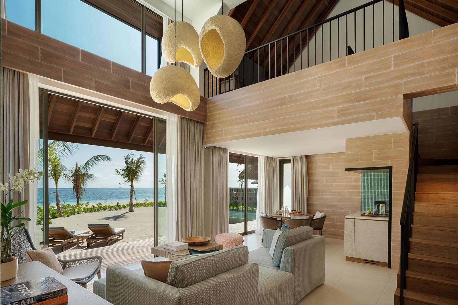 An incredibly spacious beachfront retreat, suitable for families seeking comfort and privacy on a tropical beach. The master bedroom has an adjacent study which can accommodate up to two children. The living and dining area is beautifully lit with natural light coming through its floor-to-ceiling window and opens to stunning lagoon and pool views, A small staircase will take you up to a cozy loft with views straight to the ocean or you can spend some quality time together by the pool, which features a deck and a dining area.